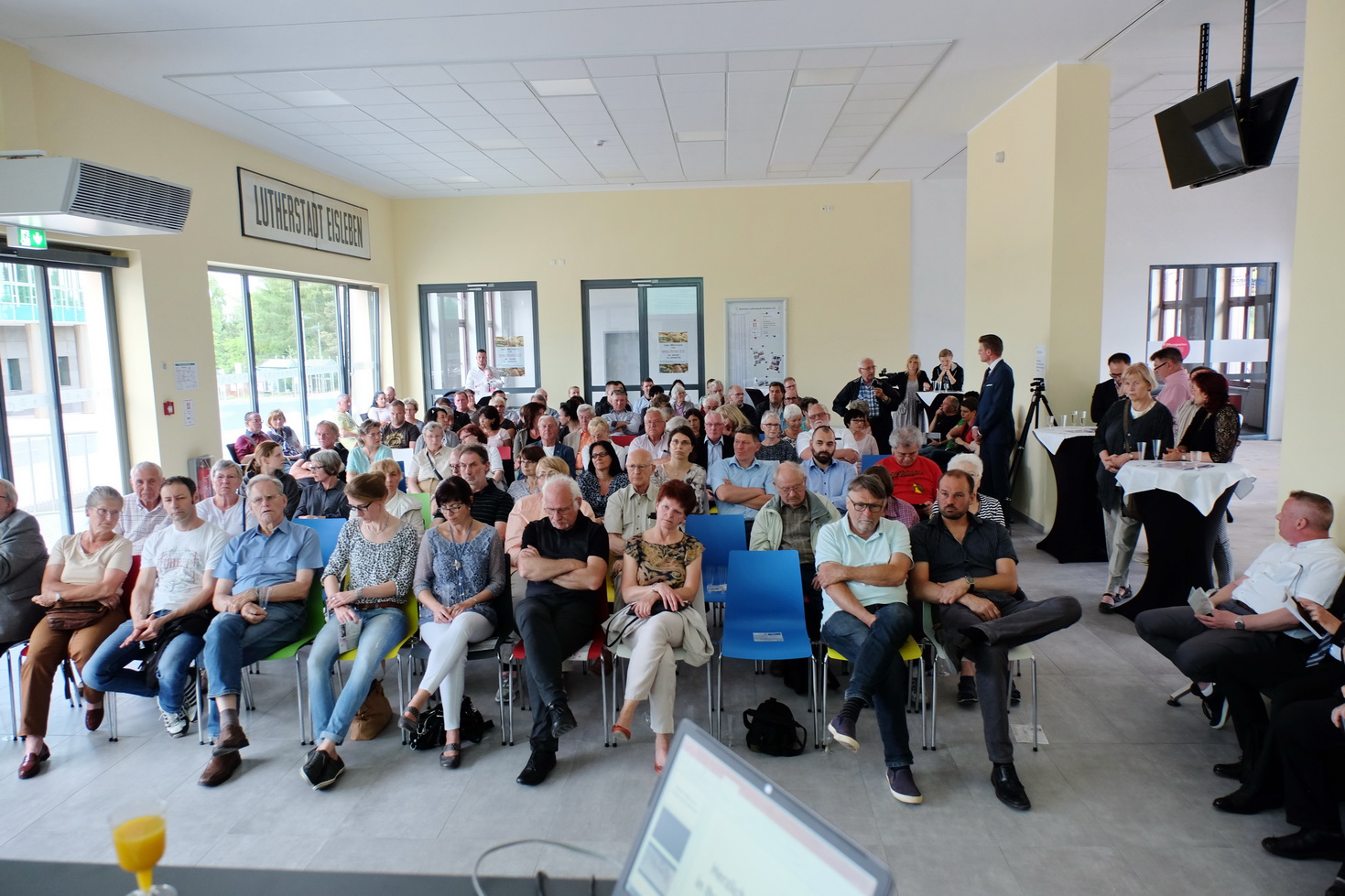 Nach mehrjähriger Vorbereitung und etwa achtzehn Monaten Bauzeit wurde unser Bahnhofsgebäude der Lutherstadt Eisleben am heuigen Mittwoch im Beisein von mehr als 350 Gästen und zahlreichen Mitgliedern der Bahnhofsgenossenschaft im Rahmen eines Festaktes eröffnet. Ministerpräsident und Finanzminister des Landes Sachsen-Anhalt, Herr Haseloff und Herr Schröder, unsere Landrätin, Frau Klein, Herr Richter als Vertreter der Oberbürgermeisterin unserer Lutherstadt, viele geladene Gäste, Vertreter der am Bau beteiligten Unternehmen, Einwohner und Freunde erlebten den Beginn der neuen Zeitrechnung für den Eisleber Bahnhof. Es wechselten sich Grußworte der Prominenten mit musikalischen Grüßen unterschiedlicher Art ab. Zwei Bahnhöfe wechselten noch die Besitzer: ein Modell des Eisleber Bahnhofes erhielt Herr Malter von der NASA als Dankeschön von der Bahnhofsgenossenschaft, den anderen, in Form einer leckeren Torte bekamen die Genossenschaftler selbst als Anerkennung vom Mehrgenerationenhaus des DKSB. Blumen für die Planer vom Eisleber Büro Mund. Und etwa 90 Minuten später war es soweit: die Lutherstadt Eisleben hat ihren alten neuen Bahnhof 2017. Viel Beifall für alle Beteiligten und ein sehr optimistischer Blick in die Zukunft.