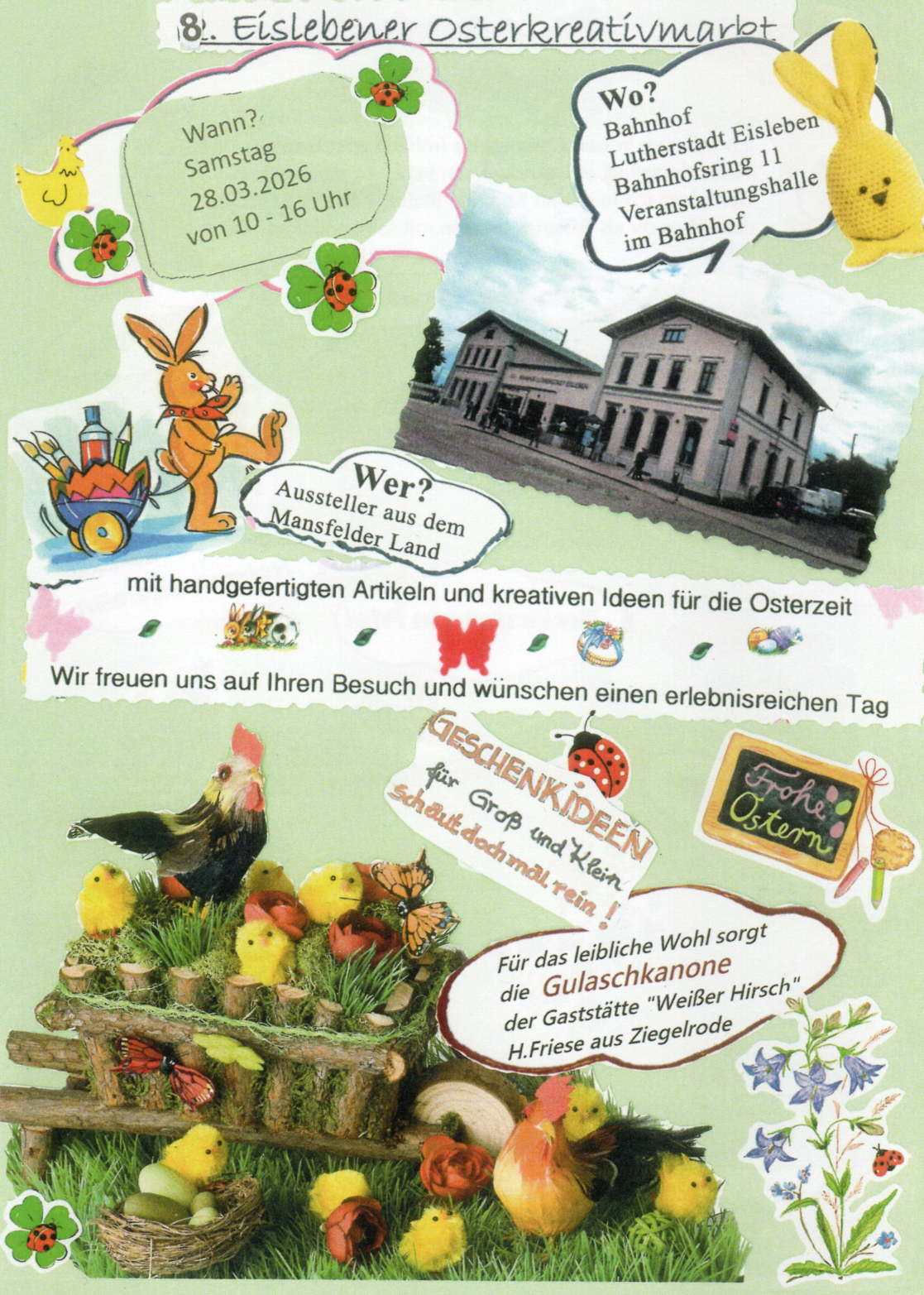 Die österliche Verkaufsschau rund um die Initiatorin Frau Kaulfuß ist mittlerweile zu einem Begriff geworden. Rechtzeitig vor den Feiertagen präsentieren sich in der beheizten Veranstaltungshalle des Bahnhofes Händler und Kunsthandwerker aus der Umgebung mit vielfältigen Angeboten zum Thema Ostern. Mit dabei sein werden neben anderen die Keramiker der Lebenshilfe, Outdoorkeramik und Floristok aus dem Mansfelder Land, Schnitzkunst by Ehrt (Schüler des Miniaturschnitzers Lauterbach), die Präsentation alter Stickkunst, Schmuckverkauf, Spezialgebäck der seit 1891 bestehenden Friwi-Werke aus Stolberg/Harz, Obst für Kinder aus Neckendorf und zahlreiche Geschenkartikelpräsentationen. Für einen schmackhaften frischen Imbiss wird die Gulaschkanone aus Ziegelrode in Stellung gebracht. Für Kinder gibt es kleine Überraschungen. Der Kreativmarkt öffnet gegen 10:00 Uhr und endet etwa 16:00 Uhr. Der Eintritt ist frei.